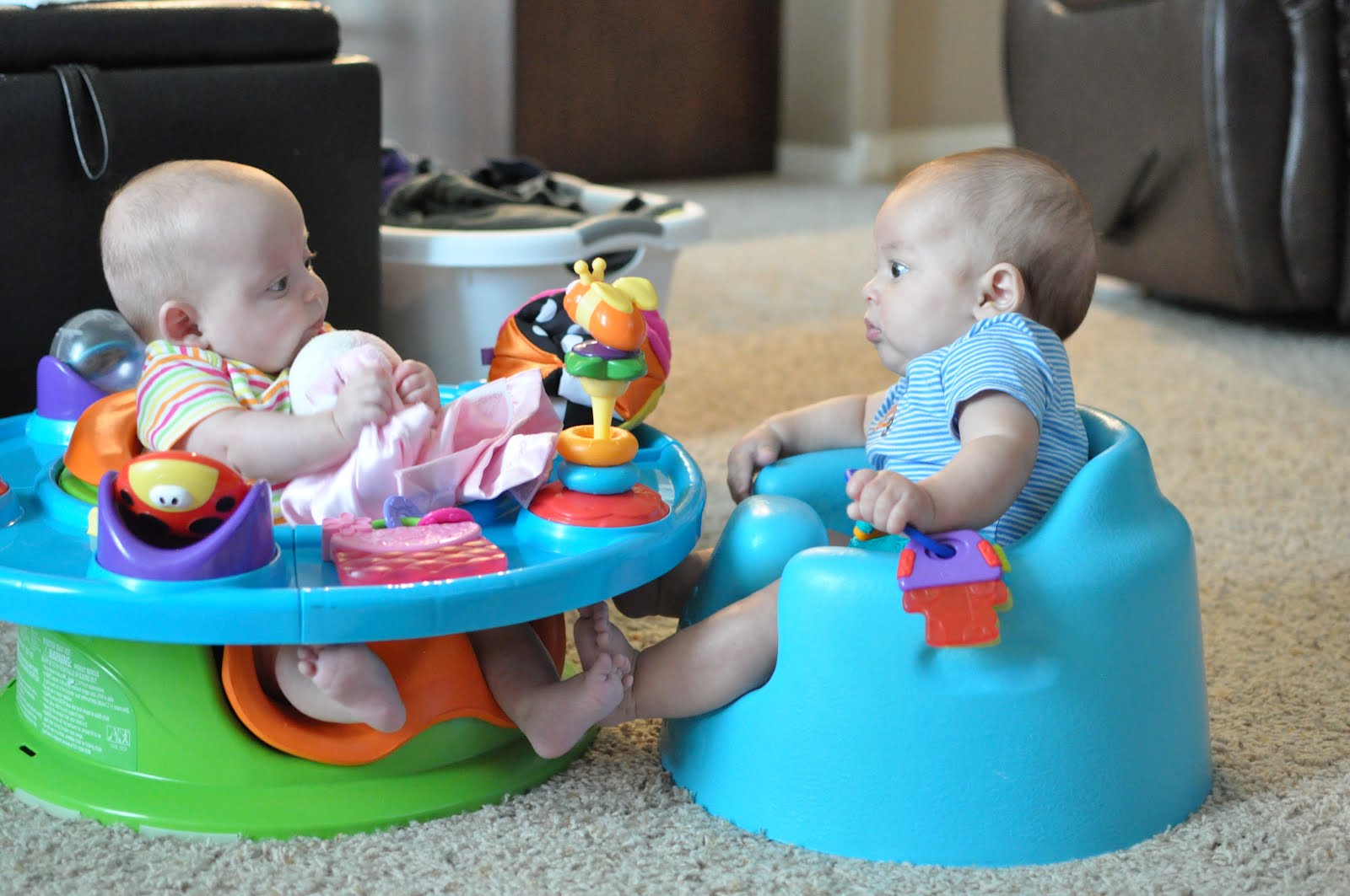 Since Chloe started reaching for toys, I decided to put her in the chair with the toys on it. And then I put Connor up next to her to show her how to play with it.